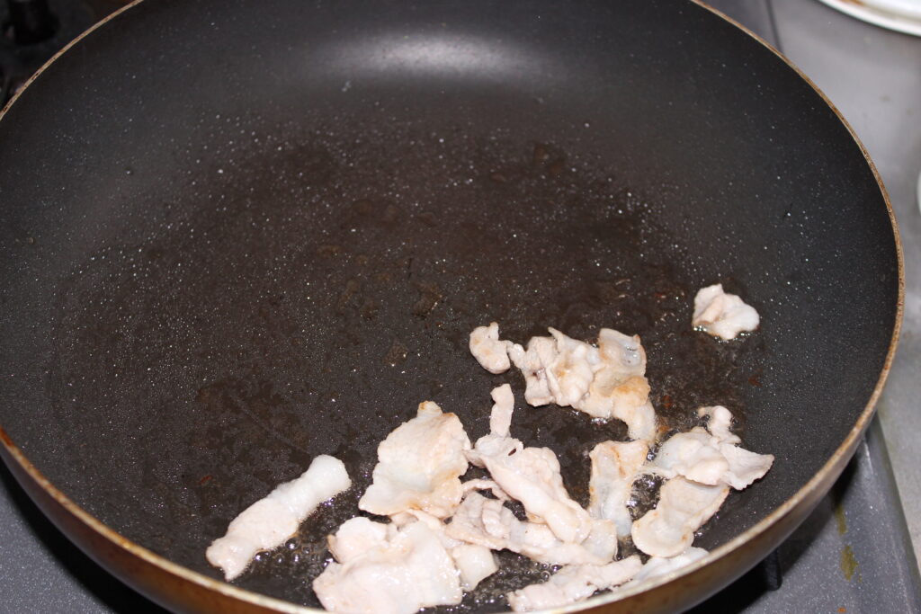 - 豚ばら肉と野菜と調味料を入れて、和える感じで炒める。