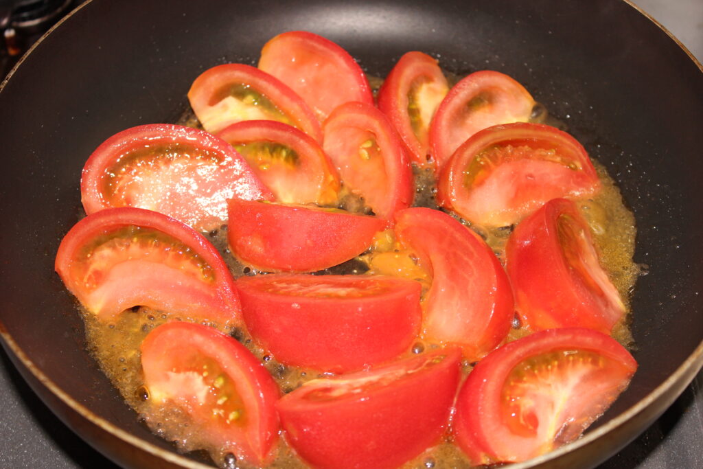 - フライパンにサラダ油をひき、トマトに軽く塩を振って片面だけ炒める。
