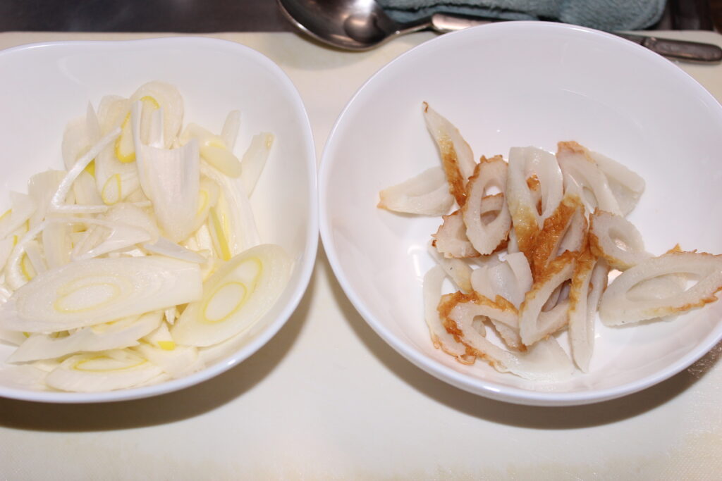 - にんじんを半月切り、大根をイチョウ切り、ちくわを斜めに薄く切る。
