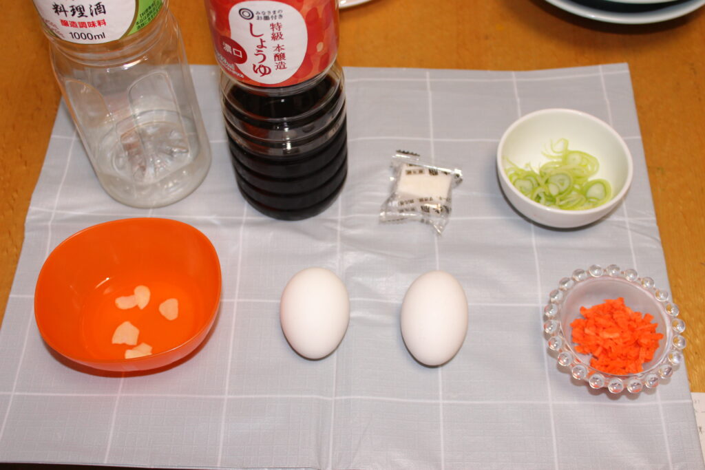 - 溶き卵とご飯を入れ、塩コショウ(多目),ショウガを入れて素早く炒める。