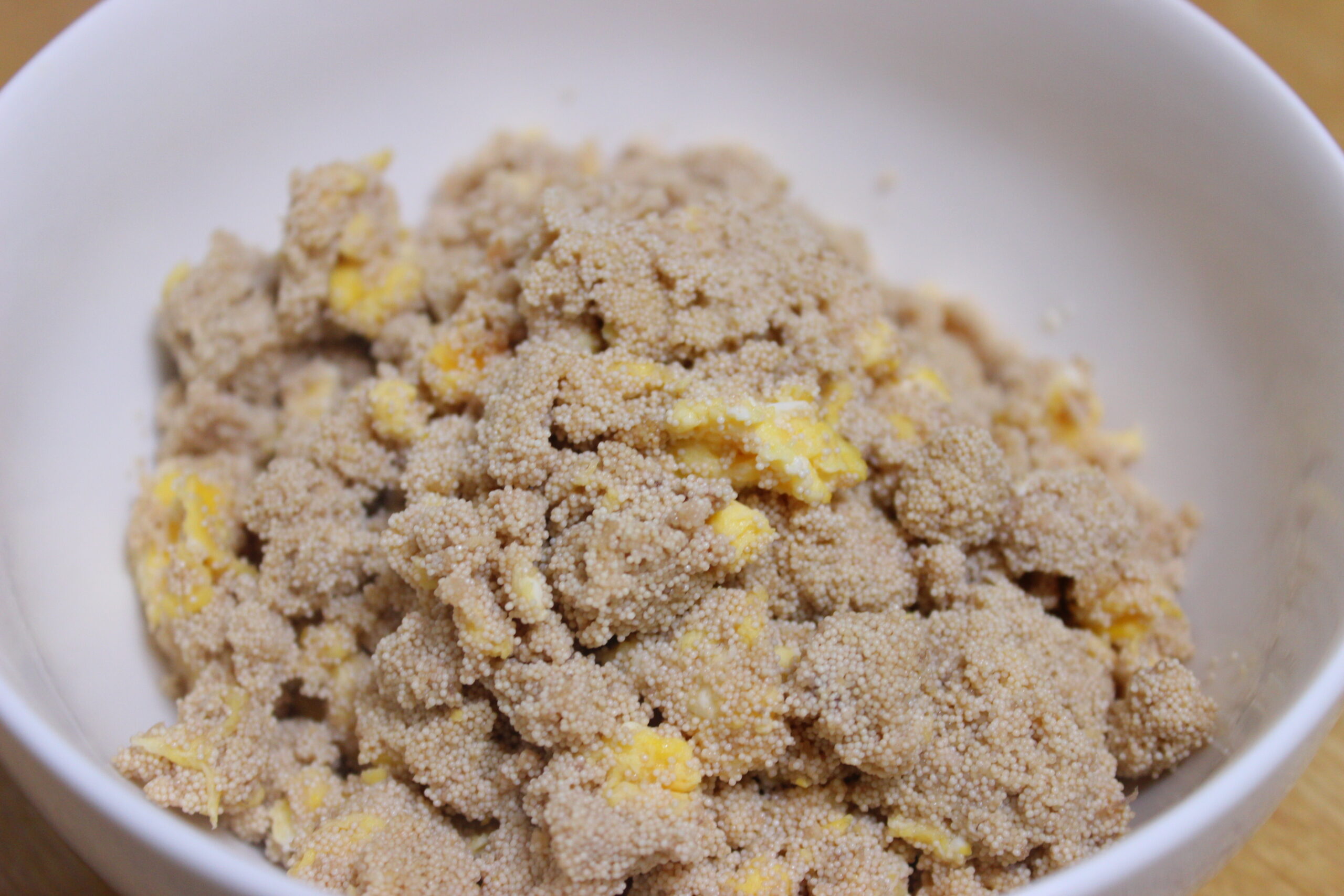 - フライパンにごま油をひき、溶き卵を入れて軽く炒め、別の容器の取り出す。
